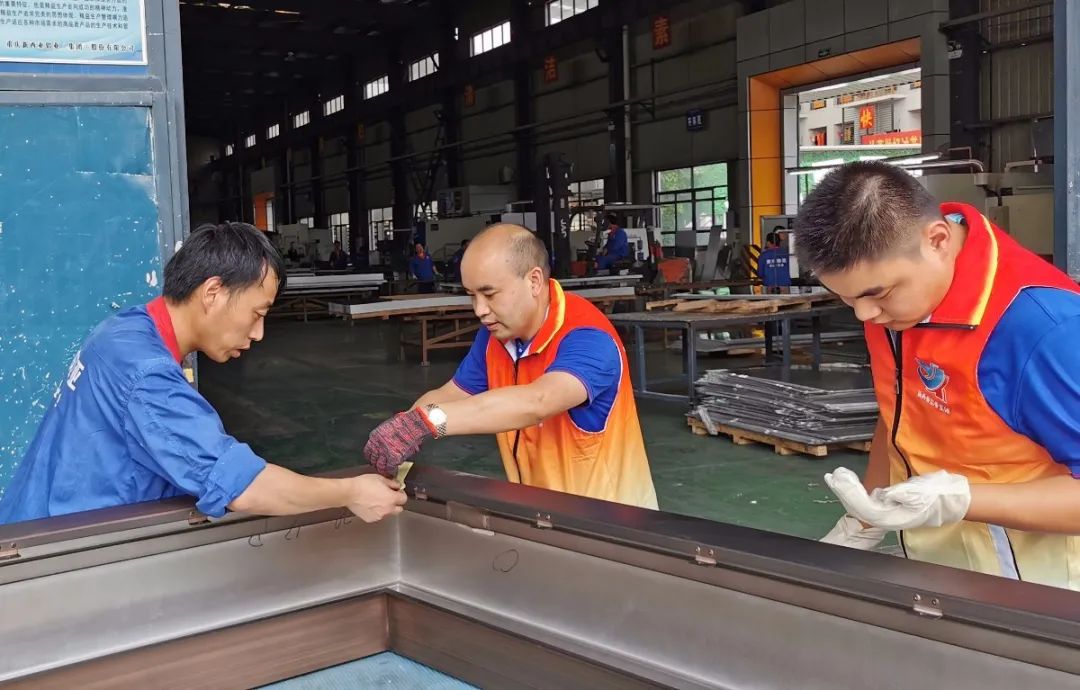 下午14時整,一支身著“黨員先鋒隊”馬甲服裝的突擊隊伍準時出現在集團公司鋁裝飾生產車間。一到車間,他們迅速找準突擊崗位,立即投入到一線工作中。有的女同志拿上較重的釘槍,毫無怨言地立足裝配工位,標準快速地打入每一顆鉚釘;有的女同志走上開料、劃線工序,協助抬板、貼標簽;全體男同志突擊噴涂拉絲崗位,認真按照工藝流程處理鋁板表面,生產現場出現一片熱火朝天的繁忙景象,極大地緩解了一線生產壓力。